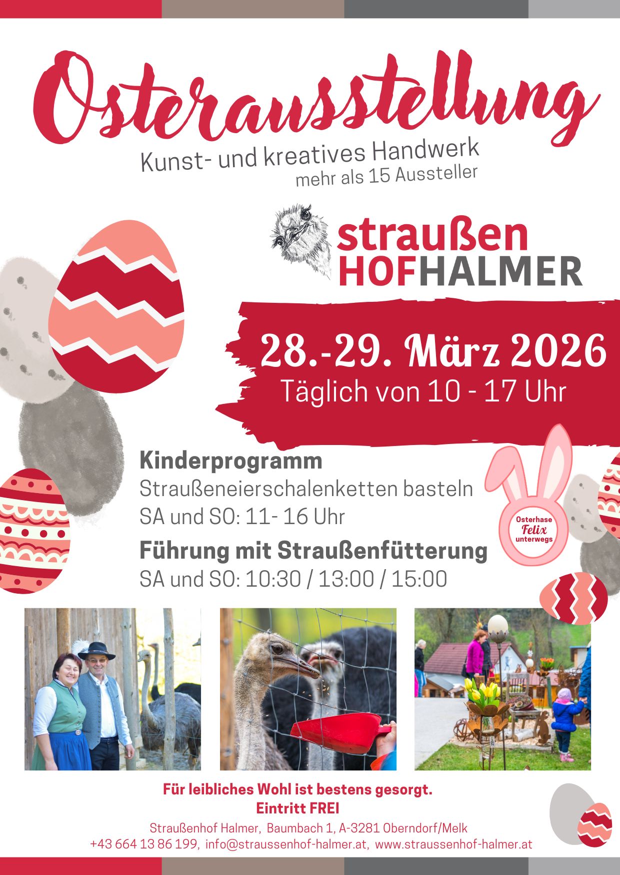 Unsere Osterausstellung findet am 28. und 29. März 2026 jeweils von 10 – 17 Uhr auf unserem Straußenhof statt. Über 15 Kunsthandwerker präsentieren ihre Werke, wie Drechsel-, Mal-, Stick-, Näh-, und Keramikarbeiten.